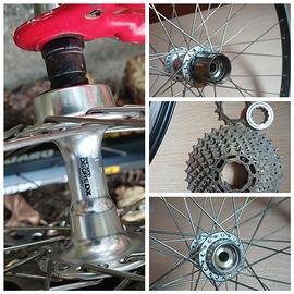 Forcella Marzocchi XCR vintage regolabile con 6 modalità diverse, steli perfetti, affondo e ritorno fluidi. Tutti i componenti sono marchiati Shimano Deore DX, compresi i mozzi e i freni.