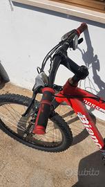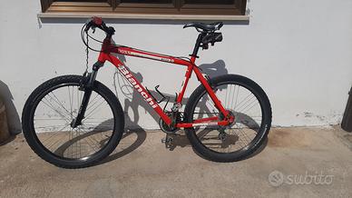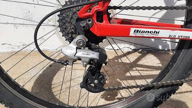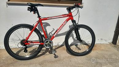 Mountain-Bike BIANCHI DOSS 4600, versione in alluminio del reparto corse Bianchi. Ottima su tracciati sterrati ma anche per correre in città. Presenta sospensione anteriore a forcelle regolabili in durezza, per personalizzarla durante l'uscita, cambio shimano completo a 8 rapporti e 3 pignoni anteriori, adatto per uso stradale e cittadino, freni a ganasce, ma con possibilità di aggiungere freni a disco sia anteriore che posteriore, avendo già la predisposizione dei fori. Monta cerchi da 26 con gomme michelin country trail.