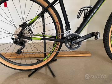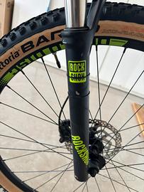 Monta: ruote da 29", forcella ammortizzata ad aria, comando sul manubrio per bloccare e sbloccare la forcella, cambio shimano xt deore 2x10, cassetta 11/36 10 velocità, freni a disco idraulici, pneumatici Vittoria con pochi km.