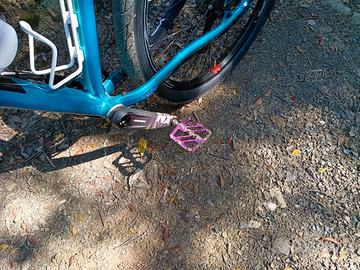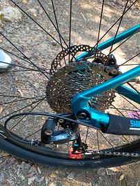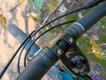 MTB assemblata pezzo per pezzo per essere utilizzata sia in cross country veloce su pineta, argini stile gravel e pump track su asfalto. Telaio e forcella da 27.5, ruote da 26" con perno passante e coperture lisce 26x2,10" con fascia interna anti foratura, cambio Sora 9 velocità, pacco pignoni 11/46, guarnitura Sram da 32, piega da 74cm in carbonio, attacco manubrio corto stile Downhill, pedali alluminio flat colore ciclamino. Bici molto compatta agile nello stretto. Ruote da 26" con canale da 30mm per evitare effetto palloncino delle coperture. Freni idraulici Shimano mt-200 con dischi dan160. Sella ergonomica in Memory Foam, bici pensata in ogni dettaglio, vendo per trasferimento all estero. il prezzo indicato è molto inferiore alla spesa effettuata ma quando si compra la bici a pezzi purtroppo ci si perde sempre. taglia per persone tra 1,60 e 1,76