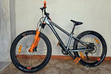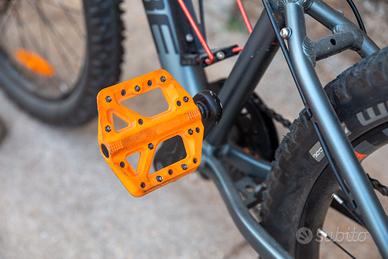 La bicicletta è stata acquistata nuova nel 2023 (prezzo 999 euro). Condizioni generali buone, tecnicamente tutto perfetto, esteticamente presenta segni di utilizzo (graffi). Sono stati installati pedali metallici arancioni crankbrothers Stamp1 e manopole Funn Hilt JR in tinta con la forcella. Altre foto disponibili su richiesta.