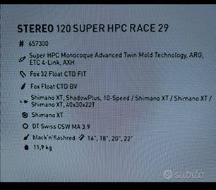 Vendesi mtb Cube stereo 120 super hpc race 29 full taglia 20, telaio in carbonio perfetta, usata poco come nuova, gomme nuove latticizzata, caratteristiche allegate in foto