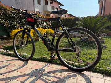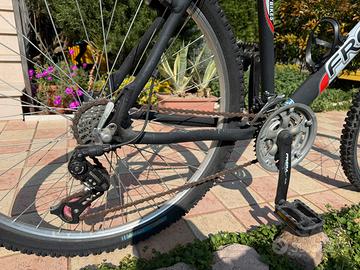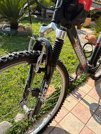 MTB FRERA Diablo - Telaio Alluminio 7005 (Da sistemare) Vendo mountain bike FRERA modello Diablo, ideale per chi cerca un progetto di restauro o una base robusta per una bici da città/sterrato. La bici è ferma da tempo e necessita di manutenzione meccanica. Caratteristiche principali: • Telaio: In alluminio 7005 (misura M). • Forcella: Ammortizzata anteriore RST. • Freni: Sistema V-Brake funzionante (pattini da controllare). • Ruote: Cerchi in alluminio; copertone anteriore OK, posteriore consumato ma utilizzabile. • Accessori: Computer di bordo, borsa telaio B'Twin, portaborraccia. Interventi necessari: • Trasmissione: La catena è arrugginita e va sostituita o trattata. • Cambio: Meccanica Shimano da regolare o revisionare (non cambia correttamente). • Manutenzione generale: Consigliata pulizia e ingrassaggio generale. Prezzo: € 50 (Trattabili per chi conclude velocemente). Venduta con formula "visto e piaciuto". Ottima anche per recupero pezzi di ricambio di qualità. Solo ritiro a mano.