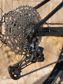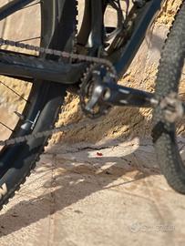 La bici è allestita con uina trasmissione Shimano Deore 12v, forcella Fox Performance 34 escursione 120mm, sospensione posteriore Fox Dps e ruote MP30 team in carbonio