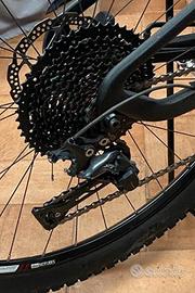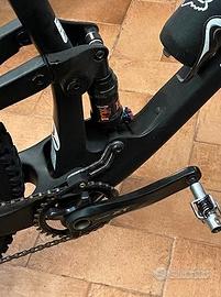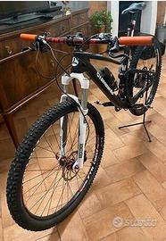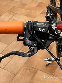 MTB marca "Lombardo" ruote 29' biammortizzata misura M in carbonio. Forcella Rock shox bloccabile al manubrio e ammortizzatore posteriore bloccabile Fox factory. Freni a disco Magura, pedali Crank Brothers, cerchi ZTR Crest, guarnitura e cambio Shimano XT, pacco pignoni 11 V. Peso 10 kg. circa