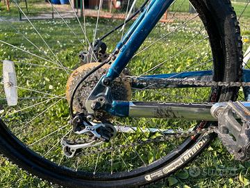 Vendo mountain bike full suspended Kona Dawg in ottime condizioni. Si tratta di una bici iconica, solida e molto versatile, ideale per il trail e l'all-mountain. La colorazione blu metallizzato è bellissima dal vivo. Caratteristiche tecniche: • Telaio: Alluminio Scandium, Taglia 19 pollici (L) - consigliata per altezze tra 175 cm e 185 cm circa. • Ruote: 26 pollici con cerchi Sun Ringle. • Pneumatici: Michelin Tubeless (latticizzati, minor rischio di forature e più grip). • Forcella: Marzocchi Bomber TST2 (regolabile e bloccabile). • Ammortizzatore: Fox Float RP2 con tecnologia ProPedal. • Cambio: Shimano Deore XT a 9 velocità, preciso e affidabile. • Componentistica: Manopole Velo, borsello sottosella Velomann incluso. Condizioni: La bici è pronta all'uso e ben tenuta. Presenta i normali segni di utilizzo di una MTB, ma è meccanicamente in ordine. Le sospensioni lavorano bene e i freni sono pronti. Disponibile per visione e prova. Consegna a mano, non effettuo spedizioni.