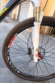 Vendo MTB in carbonio taglia L (sono alto 180 cm), ruote Miche 29" in alluminio a sgancio rapido; freni a disco: anteriore 180mm, posteriore 160mm; manubrio in carbonio da 74 cm, attacco manubrio in alluminio da 7 cm; componenti Shimano: guarnitura XT 3v 22-32-44, cambio 10v SLX, comandi cambio e freni Deore; cassetta 10v 11-36; forcella Rock Shox Reba RL revisionata 1 anno fa (bici poi usata 2 volte), con blocco al manubrio; pedali a scelta fra flat, sgancio rapido SPD o doppio (Piattaforma & Sgancio); pneumatici Continental RaceKing 2,2" con camera d'aria quasi nuovi.