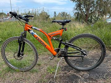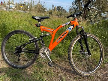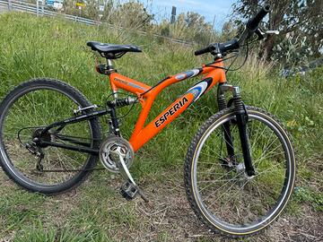Mountaine bike Esperia 26 pollici, con freno a disco anteriore, ammortizzatori anteriore e posteriore ( la vendo per il poco utilizzo ). Questa è una MTB mountain bike di marca Esperia, modello Dominator 3800. Tipo: Mountain bike 26 pollici, con sospensione posteriore (full suspension). Colore: Arancione con dettagli neri e bianchi. Caratteristiche: con freno a disco anteriore.