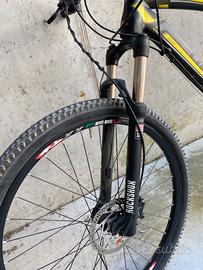 Telaio in alluminio leggero, ruote da 27.5”, forcella ammortizzata rock schox xc30, freni a disco idraulici e trasmissione Shimano a 27 velocità.
