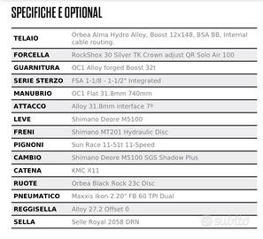 Come da titolo vendo MTB Orbea Alma H50 per passaggio a modello con sospensioni full. La bici è sempre stata tenuta con cura e ha copertoni nuovi Continental Mountain king. Prezzo leggermente trattabile.