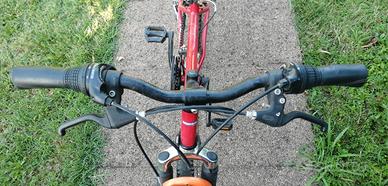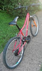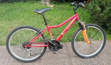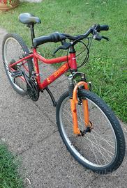Bicicletta mountain bike Decathlon, ruote da 24 pollici, colore rosso e arancio. Forcella ammortizzata, freni v-brake, cambio a 15 rapporti funzionanti. In buone condizioni generali. La bici è pronta per l'uso e si trova ad Agrate Brianza.