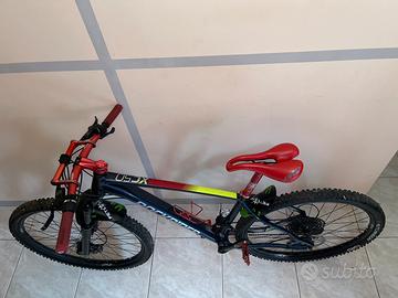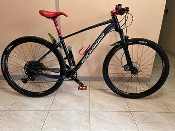 Bicicletta rock Rider XC 50 cross country colore blu spaziale, forcelle nere. con sospensioni regolabili con levetta del manubrio. Tg L)Copertoni.Hutchinson Toro 29 pollici dove all’interno ci sono le fasce vittoria antiforamento. Canotto sella Wag color rosso metallizzato, anello per stringere il canotto della sella rosso metallizzato, manubrio color rosso metallizzato più supporto per applicazione contachilometri. Pedali Defe in alluminio Rossi metallizzati con le viti per far aggrappare la suola delle scarpe. Freni a disco idraulici ancora in ottime condizioni. Davanti è presente una sola corona e posteriormente ci sono 12 pignoni, quindi 12 rapporti tutti funzionali. La catena è ancora in buono stato. Presente anche una pompa Zefal in ottimo stato. presente anche un porta borraccia d’alluminio rosso metallizzato. L’altezza da terra fino all’ingresso del canotto della sella è di 74 cm. La lunghezza totale della bicicletta da ruota a ruota e di circa 178 cm. L’altezza da terra fino all’ingresso dove si inserisce il manubrio è di 94 cm. La distanza tra l’apertura dove si inserisce il canotto della sella all’apertura dove si inserisce il manubrio calcolando la mezzeria è di 60 cm. Presenti anche dei piccoli parafanghi utili per evitare gli spruzzi di fango o di acqua. La sella è di colore rosso SMP ergonomica con l’apertura centrale per evitare compressioni alla prostata.sulla canna vicino alla corona c’è una scritta: 1X. La bicicletta frena bene, i cambi entrano bene. È stata acquistata nel 2019. È stata usata solo nei periodi estivi a partire da giugno fino a settembre solo nel fine settimana, quindi è una bici che è stata usata veramente poco ed è in condizioni ottime. Tutta la verniciatura in generale è ottima senza evidenti difetti. La bicicletta è in alluminio. I copertoni sono ancora buoni, direi solo un po’ consumati al centro. Per identificare la taglia sulla canna c’è scritto 60 13, 60 61 size L quindi questa bicicletta è una taglia L.