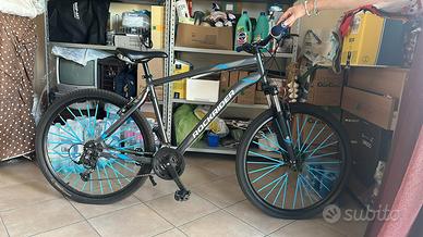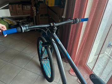 Acquistata da decathlon usata solo per un mese, come nuova. riposta sempre al coperto, cambiato manubrio, attacco manubrio e manopole colore blu. no perditempo o affaristi il prezzo è leggermente