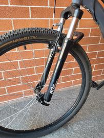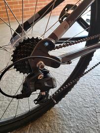 Vendo causa inutilizzo (passaggio a MTB Trek) Mtb ROCKRIDER acquistata 6 mesi alla DECATHLON di Torino. Caratteristiche principali: Telaio: In alluminio, con la tipica geometria "CGF" (Comfort Geometry Frame) di Decathlon, caratterizzata dal tubo superiore inclinato per una posizione di guida più rialzata. Sospensione: Forcella anteriore da 80 mm di escursione (si legge chiaramente il marchio "80mm" sugli steli). È a molla, adatta a smorzare piccoli urti. Trasmissione: Gruppo Microshift/B'Twin con tripla corona anteriore e 7 velocità al posteriore (21 rapporti totali). Si riconoscono i comandi cambio a manopola rotante (Grip Shift). Freni: Sistema a V-Brake (pattini), non a disco. Ruote: Misura 27.5 pollici, con copertoni "All Terrain".