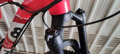 Vendo Rockrider MTB XC 100 S rossa 29” taglia L, con telaio Rockrider Cross Country. La bici è dotata di sospensione anteriore e posteriore Manitou con escursione da 120 mm e regolazione, bloccabili direttamente dal manubrio con comando in posizione intermedia o completamente bloccata. Monta trasmissione SRAM NX Eagle monocorona 1x12 ed è venduta con tutti i componenti originali. Il telaio è stato protetto con pellicole e nastri. Presenta normali segni di usura.