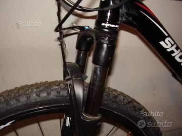 Vendo mtb alluminio marca Shock Blaze. munita di pompa, camera d'aria di ricambio, luec multifunzione posteriore. Freni a disco con dispositivo azionamento Shimano. Manubrio tipo dritto adattabile a tutte le misure. Ammortizzatore anteriore con doppia regolazione. La prima mediante selezione posta sotto l'ammortizzatore serve per regolare in modo più o meno rigido, la seconda ha il comando al manubrio e anche durante la corsa è possibile bloccare e sbloccare con sistema Roch Shok. Cambio con 3 anteriori e 9 posteriori modello Shimano. Sella marca Selle Italia con dispositivo sanitario. Mtb usata pochissimo. vendo per inutilizzo. Se necessario calcolare spese per il trasporto.