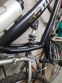 Mountain Bike della Silver Star , praticamente nuova , color nero, finiture bianche , sella ergonomica in pelle gialla , freni a disco , ammortizzatore centrale con pistone a molla ,cambio shimano (3 rapporti anteriore 6 posteriore) .