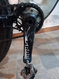 Camber 29" con telaio in carbonio e triangolo posteriore in alluminio, mozzi American classic, cerchio anteriore in alluminio posteriore in carbonio, pedivelle sram in carbonio, forcella rock shox, ammortizzatore fox float 120 mm, freni shimano xt, cambio sram gx 11 velocità