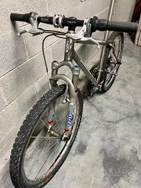 Caratteristiche principali: Telaio: Paduano Racing in Titanio (saldature artigianali a vista, condizioni eccellenti). Taglia circa M adatta a persone alte circa 175 -180 cm. Forcella: Fox F80X Terra Logic (80mm di escursione con sistema di blocco automatico intelligente). Trasmissione: Gruppo SRAM X9 con comandi rotanti Grip Shift (cambiate precise e veloci). Ruote: Mavic Crossmax 26" (ruote iconiche, leggere e tubeless). Pneumatici: da sostituire. Componentistica: Manubrio Truvativ Team, reggisella fisso Paduano in titanio.