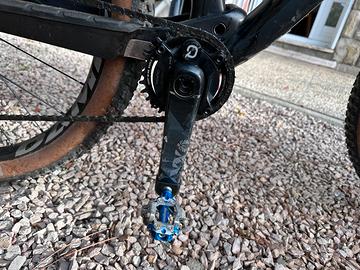 Mtb biammortizata usata, buono stato qualche graffio, upgrade maggio 2024 movimento centrale e cambio SRAM XX1 EAGLE AXS ELETTRONICO 11 velocita, pacco pignoni e catena buovi monato a giugno 2025, forcella FOX 34 SC FACTORY KASHIMA 120 mm, freno xt, reggisella telescopico FOX kascima con cordina, ruote bontrager carbonio kove 30