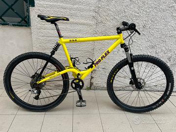 Vendo bellissima mtb vintage Pro-Flex 554, la bici è tutta revisionata alla perfezione, con forcella a molla escursione 100mm, modifica per freni a disco con Formila C1, cambio Sram X0 a 9 velocità, monocorona, si può montare sia il deragliatore anteriore che un cambio 11/12v, Reggisella Fsa in carbonio. Monta ruote nuove, anteriore da 27,5 posteriore 26.