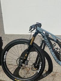 Montata Sram xx sl t-type 12v, reggisella telescopico fox, forcella fox 34 escursione 120mm anteriore e posteriore, manubrio integrato in carbonio, pedali look, completamente revisonata. Ruote in carbiono Tabros. Vendita senza Power Meter, con corona normale 34.