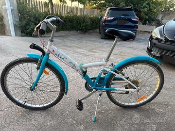 - Bici Trekking bambina 24 pollici Btwin Original 500 (9-12 anni , altezza da 135 a 150 cm) . Telaio in acciaio colore bianco/azzurro, cambio 6 Rapporti con pignoni 14-28. Freni V-Brake . Dotata di parafanghi e cavalletto. Sellino e manubrio entrambi regolabili in altezza. Peso complessivo 13 kg circa.