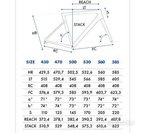 Sella con scafo in carbonio iper leggera, pedali look, le geometrie sono nella foto, é la misura più grande (58.5) che ha un tubo orizzontale di 605 mm che corrisponde ad una taglia 60 ma anche 62 guardando le misure di altri marchi…
