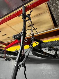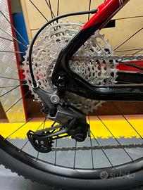 Il cambio è uno Shimano Deore e rappresenta il prodotto d'ingresso della fascia agonistica della casa Giapponese. Sistema Boost Il carro posteriore è di tipo Boost con una battuta al mozzo di 148mm. L'utilizzo di questo standard favorisce l'utilizzo di pacchi pignoni maggiorati e consente al telaio di avere i foderi orizzontali più corti rendendo la bici più maneggevole. Freni a disco idraulici L'impianto frenante a disco idraulico è uno Zoom con disco 180 millimetri per l'anteriore e 160 millimetri per il posteriore. Guarnitura monocorona Passaggio cavi interno Il passaggio dei cavi è fatto passare all'interno del telaio per una maggior protezione alle intemperie ed una migliore areodinamicità, ottenendo in aggiunta una miglior pulizia estetica. Doppio perno passante Sia il carro posteriore che la forcella anteriore hanno dei sistemi di sgancio a perno passante per le ruote. Questo sistema garantisce una maggior sicurezza rispetto al normale quick realease e sopratutto aumenta la rigidità torsionale della bici. Sterzo Tapered Lo sterzo è Tapered da 1-1/2" nella parte inferiore e 1-1/8" nella parte superiore. Questo tipo di sterzo differenziato attribuisce al telaio un maggior assorbimento degli urti ed un miglior ingresso in curva. Telaio in carbonio monoscocca Rigidezza e ottima resistenza alle torsioni sono le connotazioni principali del telaio, realizzato con fibre di carbonio di ultima generazione Toray T800-M40J. Iron viene riproposta con due nuove colorazioni, moderne ed accattivanti. Lo sterzo ribassato e conico, avvolto dalla sezione allargata del tubo orizzontale, conferisce allo snodo una maggiore solidità sul piano verticale ed una resistenza ottimale alle torsioni. Alla rigidezza del telaio contribuiscono le specifiche BOOST da 148 mm con perno passante da 12 mm.