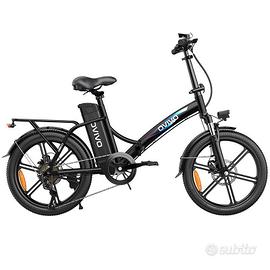 Ovivo Neo C1 E-Bike nuovo CARATTERISTICHE TECNICHE Motore: Elettrico Brushless 250W Bafang Batteria: Litio da 36V/13Ah Autonomia (PAS): 60km. Tempo di ricarica: 6/7 ore Velocità Massima: 25Km/h Cambio: Shimano 7 velocità Trasmissione Finale: Catena Sospensione Anteriore: Forcella Telescopica Ammortizzata Freno Anteriore: A Disco Freno Posteriore: A Disco Pneumatico Anteriore: 20" Pneumatico Posteriore: 20" Carico Massimo: 150Kg. Peso: 30Kg. DOTAZIONE DI SERIE Cambio Shimano Cavalletto Laterale Cerchi da 20” a sei doppie razze Faro Anteriore a 4 LED ultra-luminosi Luce Stop di arresto ed Indicatori di Direzione a LED Portapacchi Posteriore Stop Posteriore DOTAZIONI PARTICOLARI Batteria al Litio Display Multifunzione Forcella Anteriore Ammortizzata Manubrio e Reggisella regolabili in altezza Pneumatici 20” x 2.125 Sella con funzione di assorbimento degli urti