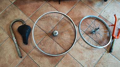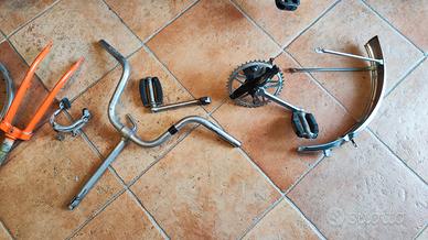 vendo in blocco o al dettaglio le parti in foto per biciclette tipo Graziella. cerchio da 24, cerchio da 20 , forcella da 20, manubrio con bloccaggio a strozzo ( raro), gruppo pedali , parafango anteriore da 20 e para catena da 24 . preferisco in blocco ma valuto proposte e acquisto al dettaglio