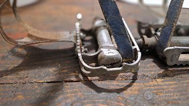 Pedali F.o.m. come da foto, quindi un po' usurati. Sono consumati anche sulle punte. Completi di gabbiette e lacci. Formula visto e piaciuto. Adatti a bici tipo bianchi cdm, folgore, Parigi Roubaix, legnano, cinelli, Campagnolo. Possibile spedizione o ritiro a mano in zona Lodi o Milano.