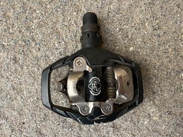 Pedali shimano da bicicletta con predispisizione per attacchi di scarponcini per avere una presa salda e sicura sul pedale.