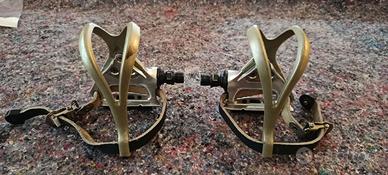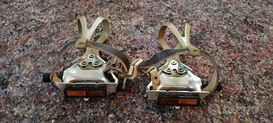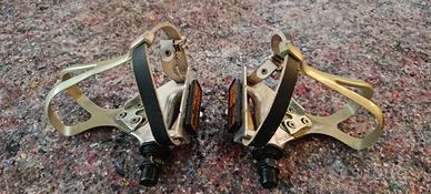 Pedali Shimano PD A550 made in Japan vintage. Completo di gabbietta ferma piedi e cinghiolo in cuoio. Cuscinetti ingrassati e silenziosissimi. Perfetto per Eroica e ciclo storiche. Vendo per passaggio a pedali ancora più antichi. Consegna a mano prov. Bergamo, Brescia e limitrofi.