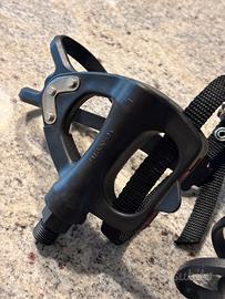 Vendo pedali VP Components in materiale composito con superficie rivestita con antiscivolo e gabbiette con laccio rimovibili.
