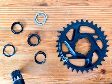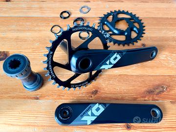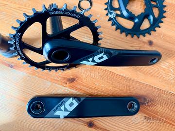 Vendo come da titolo pedivelle Sram x01 Eagle in carbonio da 175mm per movimento centrale GXP. Fornisco il movimento centrale in ottime condizioni, la corona Sram Eagle X-Sync 2 da 32t originale ancora nuova con offset standard 6mm e montata già sulle pedivelle una corona Leonardi Racing da 34t con offset boost. Fornisco anche il distanziale di precarico e vari distanziali per il perno da 24mm. Come da foto, presentano soprattutto nella pedivella senza corona segni di contatto con rocce/sassi che non ne pregiudicano il funzionamento. Disponibile anche per spedizione con Poste Italiane con spese a vostro carico.