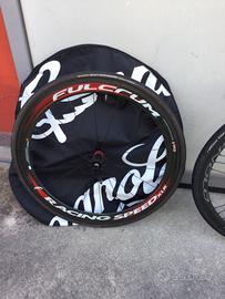 Tre set di ruote, fulctum racing zero in alluminio con mozzi in carbonio e cuscinetti ceramici, Campagnolo Bora One in carbonio per copertoncino, con profilo da 35mm e Fulcrum Racing Speed XLR in carbonio per tubolare, con profilo da 50mm.