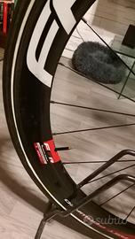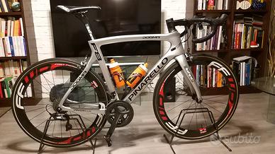 Taglia 56, bici perfetta, usata solo per alcune Gran Fondo e alternata con altre bici, in totale non ha percorso più di 1500/2000 km. Ruote FFWD profilo 55 con tubolari Vittoria Rally da 25mm nuovi. Manubrio integrato MostTalon 120×44, Selle Italia SLR Team Edition S1, cavi, guaine e pattini nuovi (300 euro di lavori). Staffa per Garmin e portaborracce Pinarello carbonio. Ruote e bici prive di segni, graffi o abrasioni.