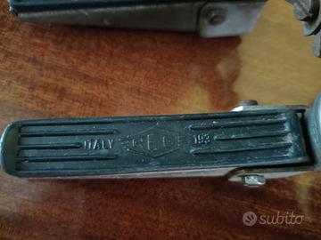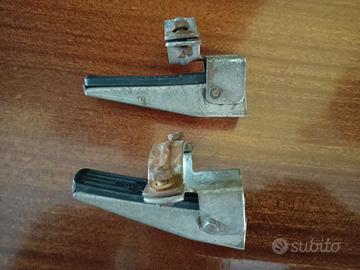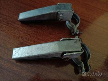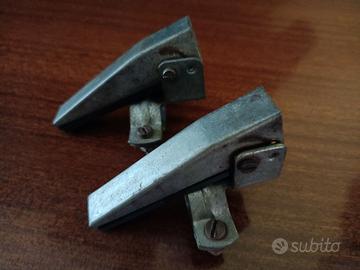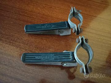 Coppia di poggia piedi per bici, con attacco a fascetta per applicarli alle forcelle solitamente per passeggero bimbo, hanno lo snodo per renderli richiudibili. Conservati e mai usati, sono in metallo con le coperture in gomma, marca REG Italy 193. Lunghezza poggiapiedi cm 8 (escluso l’attacco). Spedisco con Poste Italiane.
