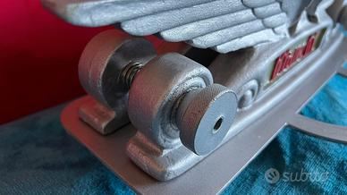 Perfetta riproduzione del porta bici Bianchi che veniva prodotto un secolo fa e che veniva usato anche per le bici dei grandi campioni come Coppi e Gimondi. La base è in metallo e il corpo in resina poliuretanica. Come l’originale si adatta ad ogni tipo di bicicletta e larghezza della ruota tramite la regolazione dello spazio tra le parti a forma di ali, per mezzo di due manopole da avvitare su perni filettati. Nelle foto si vede molto bene il sistema che è lo stesso adottato all’epoca e che permette alla bici di essere solidamente dritta nella sua esposizione.
