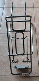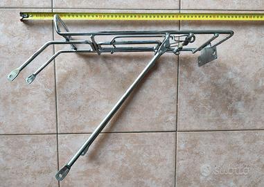 Vendo porta pacchi (portapacchi) per bicicletta da turismo Uomo/donna, in acciaio, molto robusto, adatto per applicarvi seggiolino per bambini. Completo di gancio con molla. Predisposizione per fanalino.
