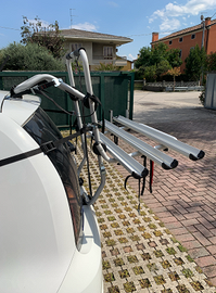 Il portabici posteriore in alluminio Padova 3 bici permette di portare bici fino a 28", con binario in alluminio e è completamente regolabile. Per bici con interasse fino a 29" (interasse massimo 120 cm) Porta ciclo per auto per 3 bici in alluminio doppia cinghia alta (punto soggetto a sollecitazione), 6 cinghia a tenuta forte (testati per uno sforzo di 250 kg ciascuna), 6 ganci temprati (testati per uno sforzo di 350 kg ciascuno), fibbie in acciaio, sistema anti-distacco per le cinghia inferiori, cinghia di sicurezza cucita direttamente sul portabici