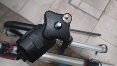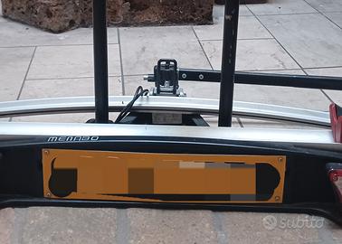 Portabici da gancio di traino usato, ma tenuto bene. Sostituito una barra originale con una più ampia, x mtb con ruota larga. Nel prezzo è compreso le due barre originali e una larga. Le chiusure hanno la chiave per una maggior sicurezza. Questo porta bici può portare una bici muscolare e una e-bike.
