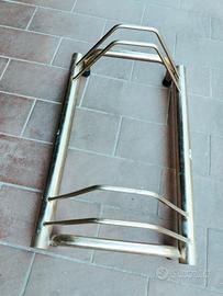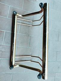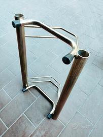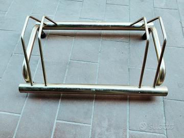 portabici da terra. rastrelliera per 2 biciclette con pneumatici fino a mm 52 di larghezza posata a pavimento in acciaio zincato tubolare diametro 45 mm con 4 tappi in gomma per posa a terra altezza cm 25 lunghezza cm 64 profondità cm 41 peso kg4,1 colore oro ferri tondi che trattengono i pneumatici da mm 10