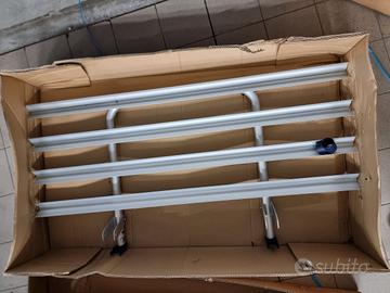 Portabici da posteriore in alluminio, dimensioni 120×60 cm, capacità fino a 4 biciclette. Struttura in profilato di alluminio, compreso di staffe di fissaggio e culle reggi-ruota e bracci fermatelaio, portata complessiva 60 kg (15 kg per bici).
