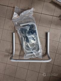 Portabici da posteriore in alluminio, dimensioni 120×50 cm, capacità fino a 2 biciclette. Struttura in profilato di alluminio, compreso di staffe di fissaggio, culle reggi-ruota, bracci fermatelaio con serraggio rapido e gomma antiscivolo, portata complessiva 55 kg (27.5 kg per bici).