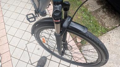 DISPONIBILE PER PROVA Vendo per passaggio a modello ingresso facilitato, bici elettrica da trekking, usata pochissimo (1100 km 12 cicli di ricarica) e in ottime condizioni. Ideale per chi cerca comfort. Bici con tutti gli accessori originali. Telaio: In alluminio 6061, design unisex con geometria ribassata per una salita facilitata, garantito a vita da Decathlon. Taglia M (adatta a stature da 1,66 m a 1,77 m). Motore: Shimano Steps E6100 centrale, ultra-silenzioso, con coppia di 60 Nm, ideale per lunghe distanze e salite impegnative. Offre un’assistenza fluida e reattiva fino a 25 km/h. Batteria: Shimano Lithium-ion 36V, 11,6 Ah (418 Wh), con autonomia fino a 120 km in modalità eco (circa 60 km in modalità massima assistenza). Peso batteria incluso: 21,6 kg . Trasmissione: Deragliatore Shimano Deore a 10 velocità, corona anteriore in alluminio da 38 denti, pedivelle in alluminio da 170 mm. Ruote e Pneumatici: Ruote da 28” a doppia parete in alluminio con sgancio rapido. Pneumatici Vittoria Terreno Dry 700x38c (120 TPI), perfetti per strada e sentieri gravel. Sospensioni: Forcella anteriore Suntour NCX SF17 con 63 mm di escursione, regolabile e bloccabile, ideale per terreni misti. Freni: Dischi idraulici Tektro TKD da 160 mm (anteriore e posteriore) con leve in alluminio, per una frenata precisa e sicura su terreni asciutti e bagnati. Manubrio e Sella: Manubrio semi-rialzato in alluminio (620 mm) con manopole ergonomiche e bar-end integrati. Attacco manubrio in alluminio da 75 mm. Sella Active 60, progettata per il massimo comfort. Accessori Inclusi: Cavalletto, campanello, luci anteriori e posteriori, catarifrangenti ruote, pedali in plastica monoblocco, portapacchi, parafanghi e specchietto retrovisore. Compatibile con seggiolini per bambini e portaborraccia. La bici è in eccellente stato, sempre conservata al coperto e sottoposta a manutenzione regolare. Nessun segno di usura, componenti originali e perfettamente funzionanti. VISIONABILE SENZA IMPEGNO