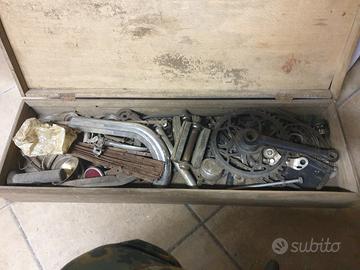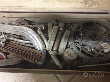 cassettina piena di pezzi e rivmcambi per biciclette d'epoca, corone pignoni pedali catarifrangenti eccetera, in blocco