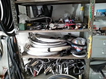 Copertoni, portapacchi, cerchi completi per bici a bacchetta , mozzi, selle, parafanghi, copricatena completi, carter in acciaio, carter a pistola, pipe e attacchi manubri, pedali di ogni genere, manubri, freni, gommini, porta pattini, fanali anteriori e posteriori, paramanubrio, cavalletti laterali e centrali, tubi sella e tantissima minuteria.