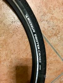 Vendo 2 copertoni per city bike, michelin protek cross,per cerchi da 28”, misura 622 (700x400)in ottimo stato,montati in estate 2023,coppia parafanghi in ottimo stato,sella imbottita da donna in ottimo stato,manubrio con leve freno ,manopola cambio,guaine e freni a v,portapacchi posteriore universale con catadiottro da sostituire.Solo in blocco